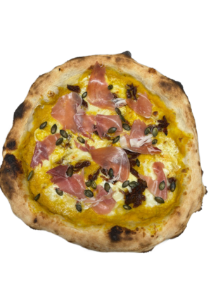 Sos dyniowy z czosnkiem, szynka crudo, suszone pomidory, camembert, prażone pestki dyni